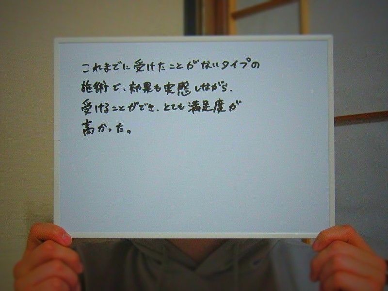 こちらで施術を受けるまでいろいろな手法の治療(施術)を受けてきましたが、仲々痛みがとれずにいましたがこの治療法(施術法)で、1ステップ良くなりました。 まだ、完全に良くなったのではありませんが、大変良くなった感じです。